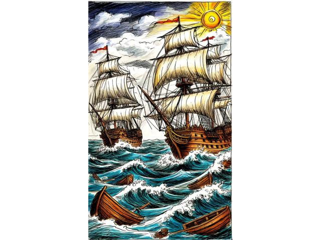 Недели плыли за неделями, а земли всё не было видно. Команда роптала, грозила бунтом. И вот однажды ночью разыгрался страшный шторм. Волны, как великаны, швыряли корабли, паруса рвались, а компас перестал слушаться.