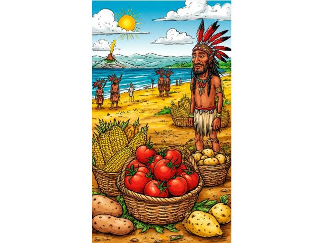 На берегу путешественники встретили людей с медной кожей, которые принесли им дары — кукурузу, картофель и… целые корзины алых помидоров!