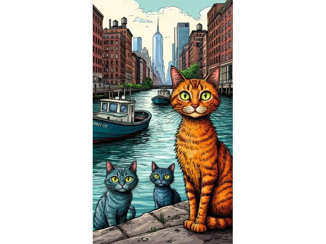 Эти коты были хранителями водного царства Нью-Йорка. Они следили, чтобы реки и каналы оставались чистыми, а корабли благополучно добирались до берега. Их шерсть переливалась, как нефтяная плёнка на воде, а глаза светились, как маяки.