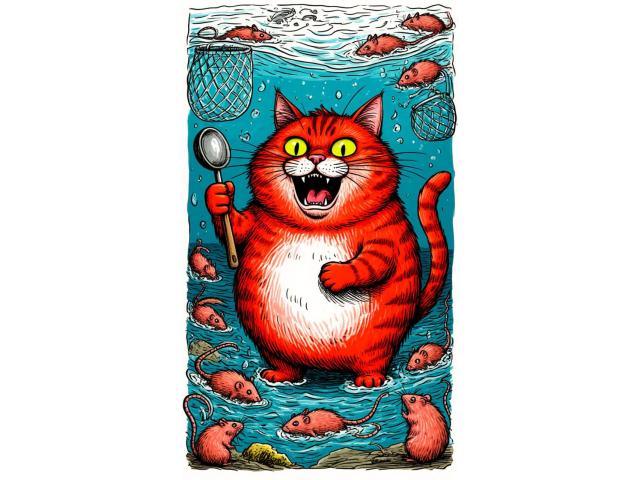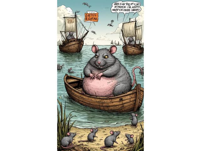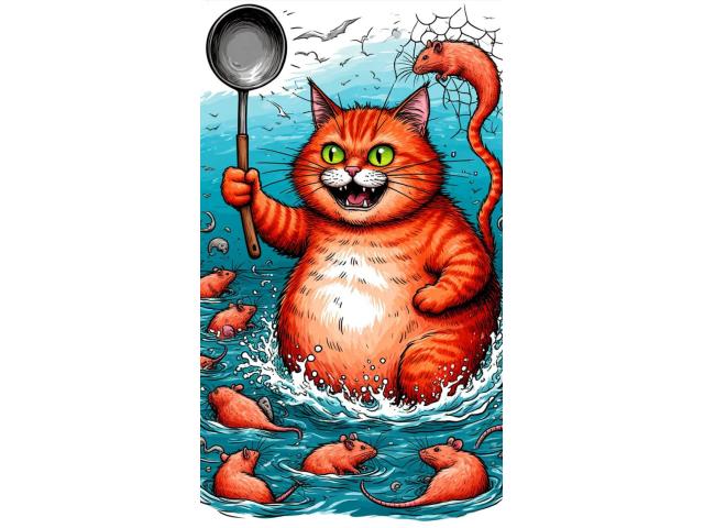 И вот, вооружившись поварёшкой и сетью для морепродуктов, Кот Мяу возглавил атаку. Он так громко замяукал на своём бруклинском наречии, что крысы в ужасе попрятались. А потом водяные коты устроили водоворот и смыли всю Крысиную флотилию прямо в открытый океан!