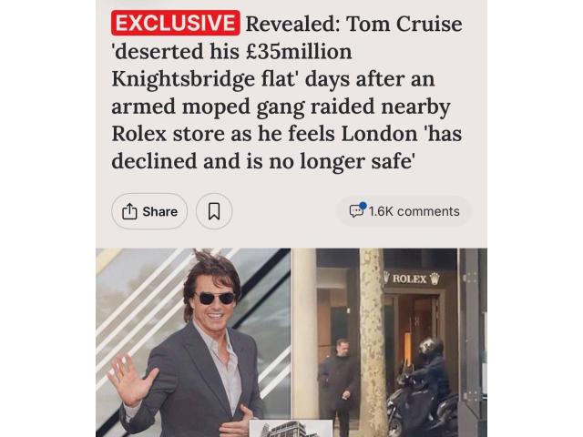 Известный актёр Том Круз покинул свою квартиру в элитном лондонском районе Найтсбридж стоимостью 35 миллионов фунтов стерлингов, потому что считает, что этот район больше не безопасен